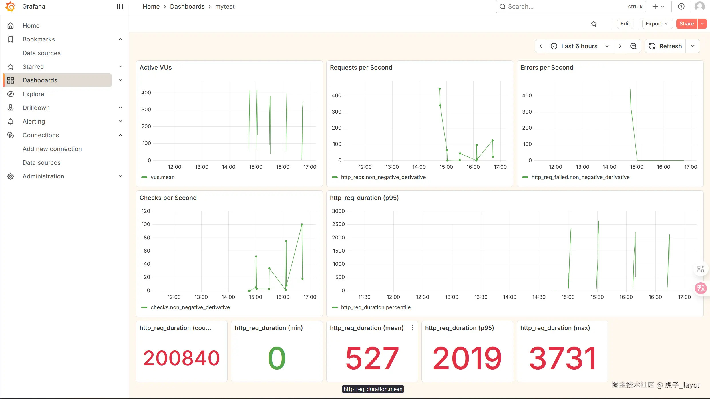 - 即可实时查看 VUs、RPS、http_req_duration、错误率曲线