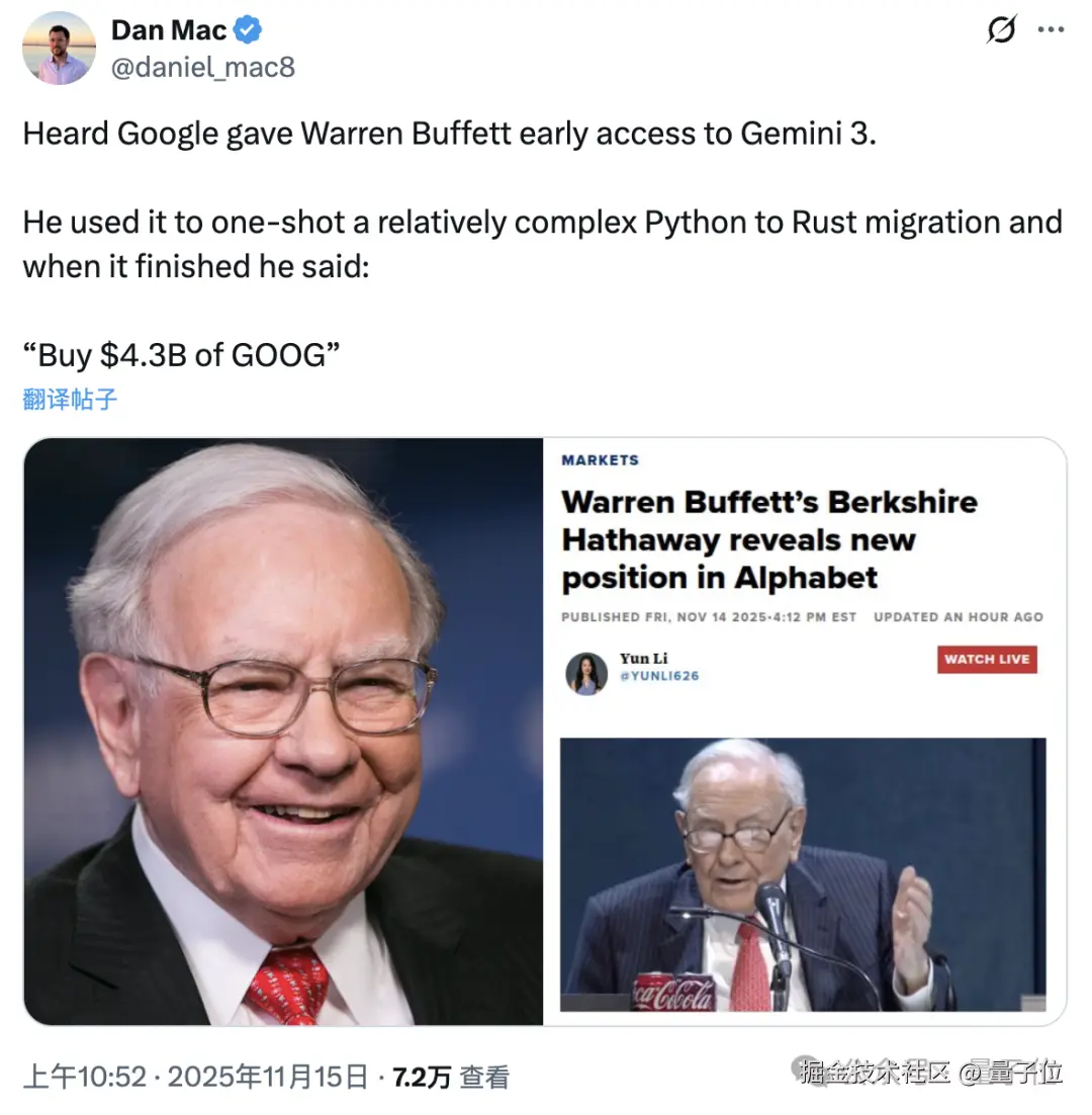 1\][x.com/minchoi/sta...](https://link.juejin.cn?target=https%3A%2F%2Fx.com%2Fminchoi%2Fstatus%2F1989372162336301115 "https://x.com/minchoi/status/1989372162336301115") \[2\][www.businessinsider.com/gemini-3-la...](https://link.juejin.cn?target=https%3A%2F%2Fwww.businessinsider.com%2Fgemini-3-launch-google-ai-race-chatgpt-2025-11 "https://www.businessinsider.com/gemini-3-launch-google-ai-race-chatgpt-2025-11") \[3\][www.dailymail.co.uk/yourmoney/a...](https://link.juejin.cn?target=https%3A%2F%2Fwww.dailymail.co.uk%2Fyourmoney%2Farticle-15292817%2Fwarren-buffett-alphabet-investment.html "https://www.dailymail.co.uk/yourmoney/article-15292817/warren-buffett-alphabet-investment.html") **欢迎在评论区留下你的想法!** --- **完** ---