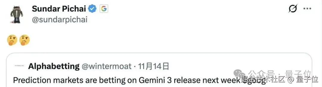 甚至有机构发起了猜猜乐,消息还被谷歌 CEO 劈柴哥亲自转发,并配上了两个耐人寻味的 emoji 符号。