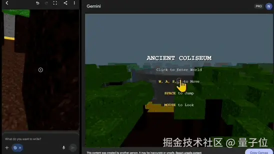 当然说到交互,还有更复杂的效果,下面这个《我的世界》风格的竞技场,不仅画风毫无二致,还支持像在真的游戏当中一样移动探索。
