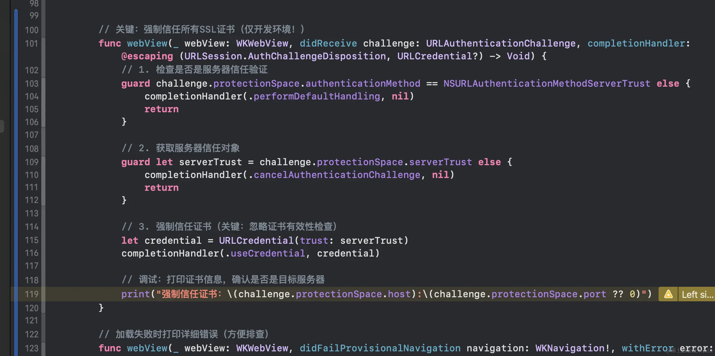print("强制信任证书:\(challenge.protectionSpace.host):\(challenge.protectionSpace.port ?? 0)")