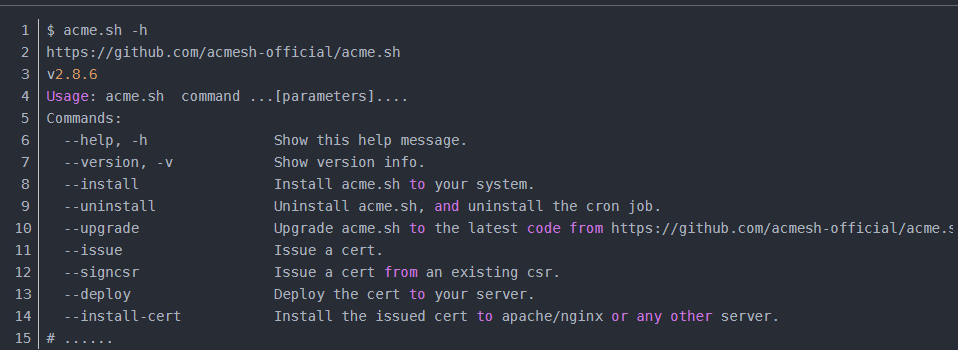 验证安装是否OK,执行 acme.sh -h,如果输出版本等信息,则表示OK