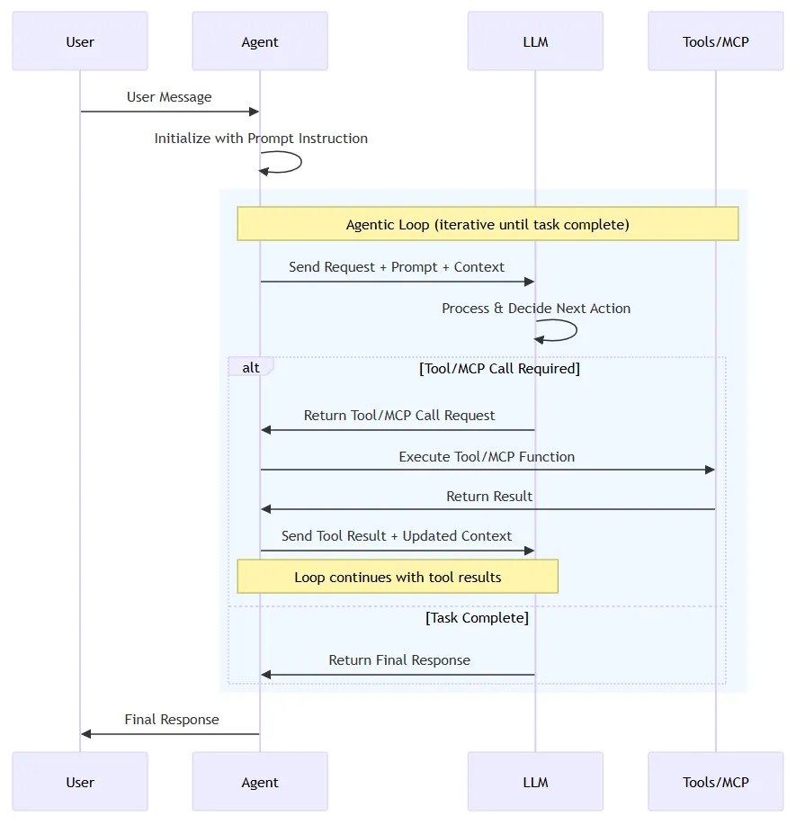 让我们再来看看AI Agent(又称为AI智能体)是什么,它其实是一个使用LLM来处理用户输入、做出决策、调用工具(MCP服务器)来执行并生成响应以完成某个具体的任务。
