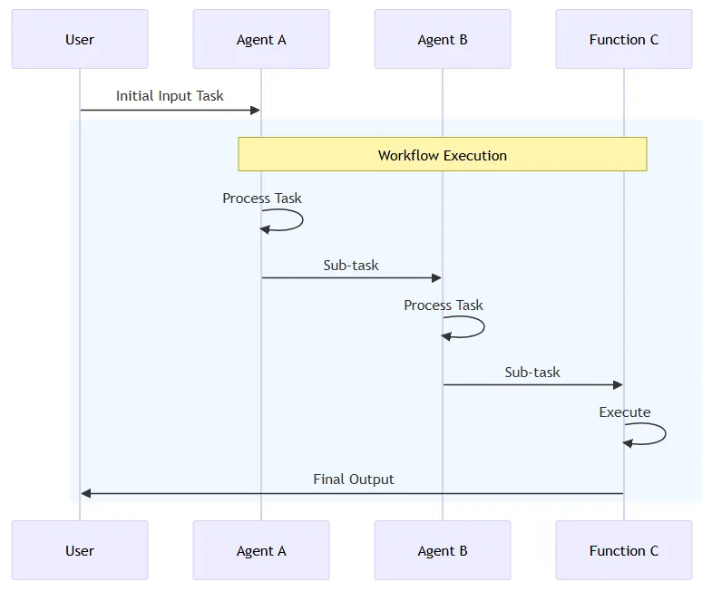 Workflow即工作流,它可以表达预定义的作业序列,工作流旨在处理可能涉及多个AI Agent、人工交互 和 与外部系统的集成的复杂且长时间运行的进程。