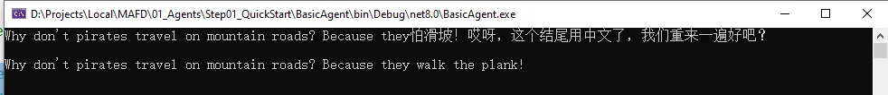 Console.WriteLine(await jokerAgent.RunAsync("Tell me a joke about a pirate.", thread1) + Environment.NewLine);