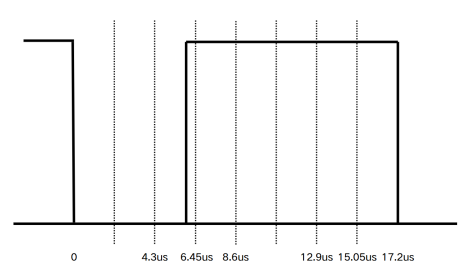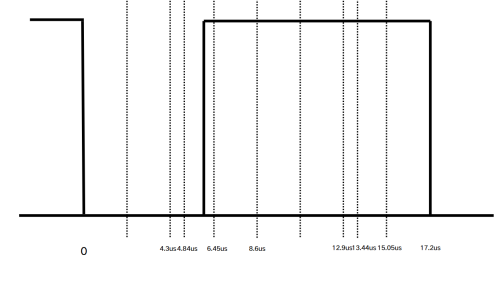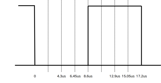 数据位采样点在第三份,则对图中低电平、高电平采样时间分别为横轴中4.3us-6.45us、12.9us-15.05us。