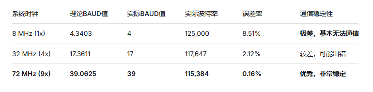 由此可见由于分频系数只能取整数导致实际波特率偏离目标值且会随着采样倍频变化而变化,可通过以下方法改善此问题