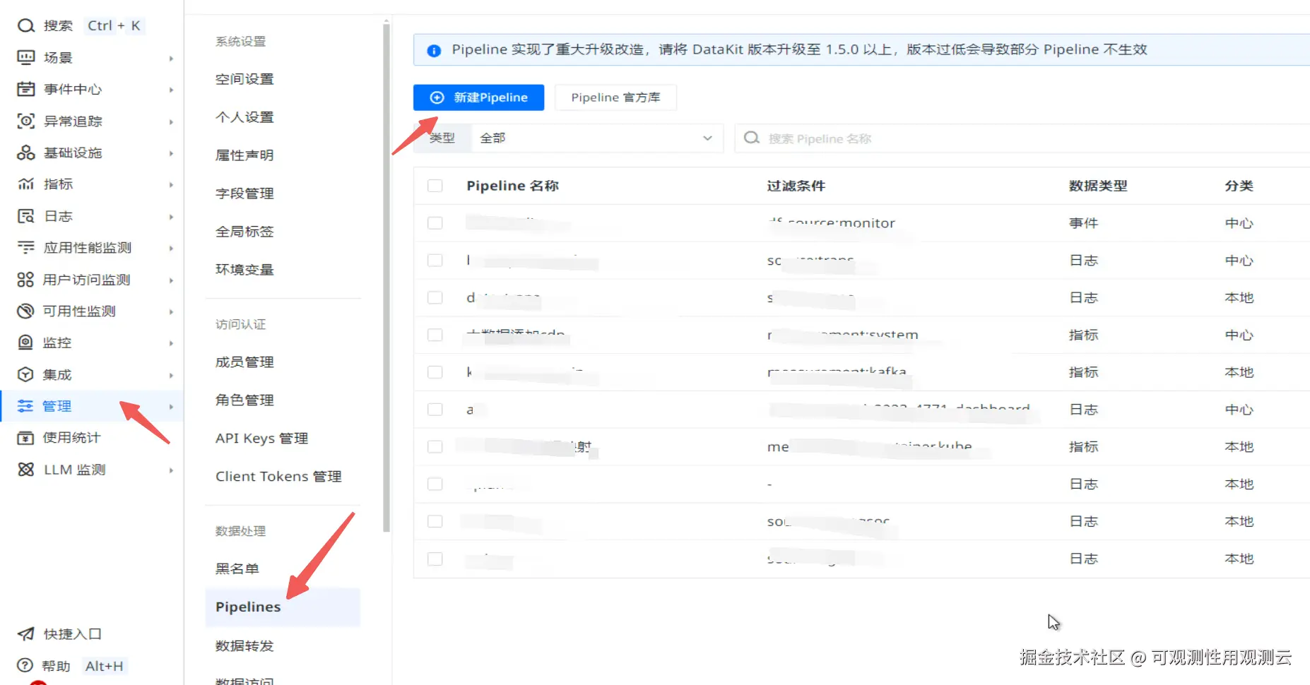 通过观测云管理菜单下面的 Pipeline 菜单进入 Pipeline 菜单管理页面(因为是需要对指标数据进行 Pipeline 处理,只能通过该菜单进入才能创建处理指标的 Pipeline),并创建一个新的 Pipeline。