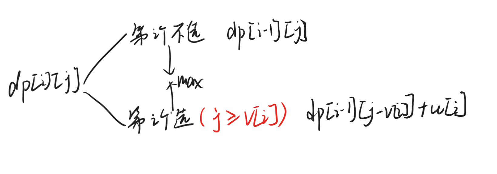 当选时,首先要判断第i个物品体积是否大于j,如果大于了,只选第i个都已经过大了,显然不满足要求,因此我们要加个判断条件,在此条件下,它就等于从前i-1个物品中选一个体积不超过j-v[i]的价值加第i个物品价值(并不是看前一个元素)。(v数组表示每个物品的体积,w数组表示每个物品的价值)