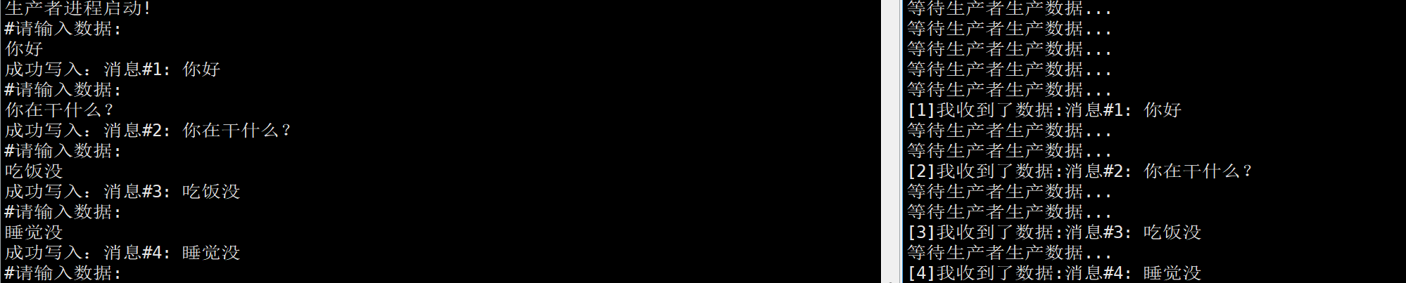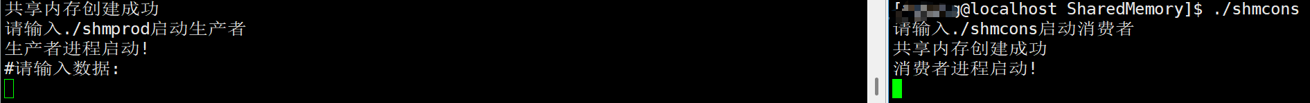 在两个终端分别输入./shmproc与./shmcons就可以进行两个不同的进程通过这个共享内存进行通信!
