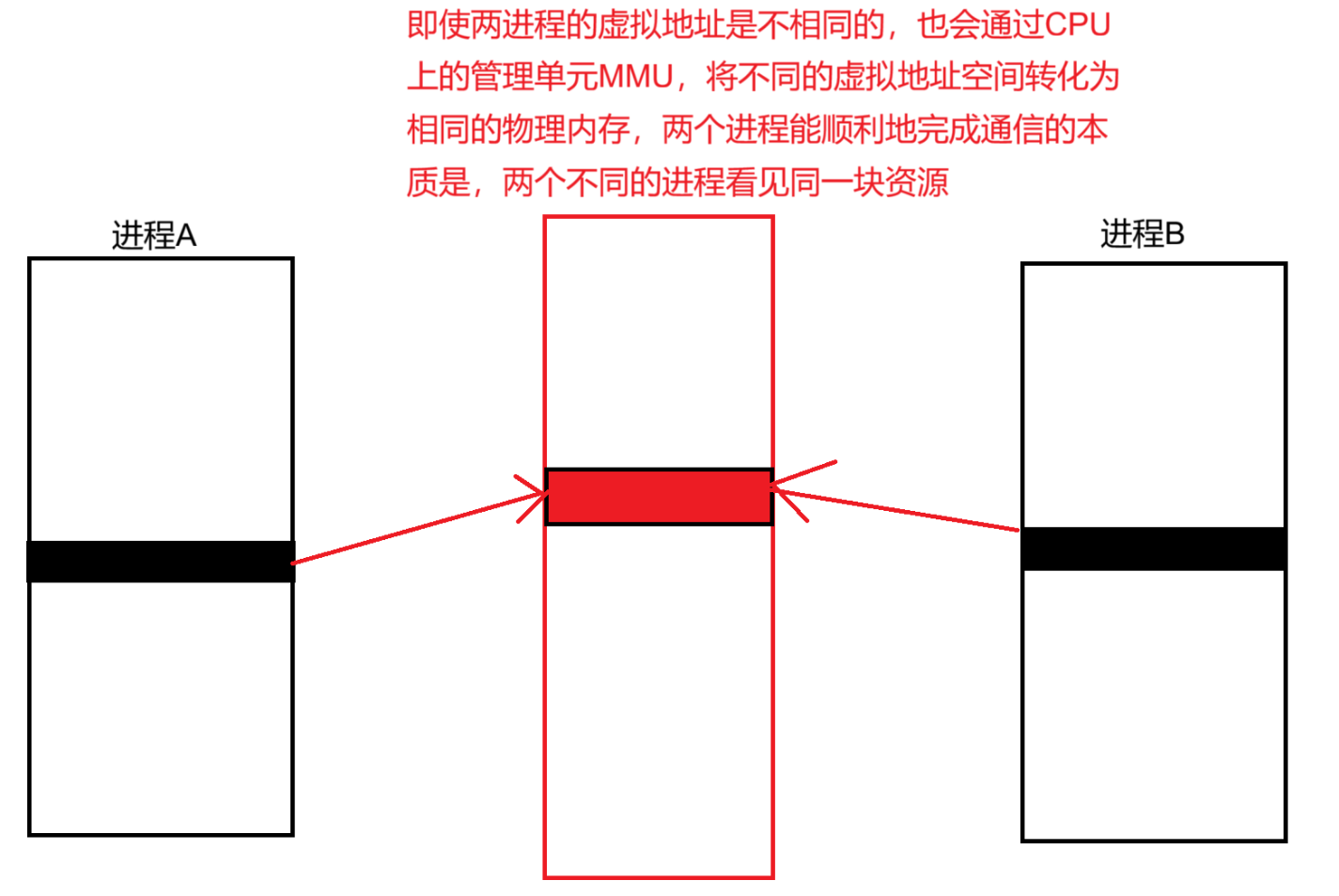 进程是操作系统分配资源的基本单位,因此,不同的两个进程,它们的虚拟地址空间是不同的,因为要防止它们互相影响,不同进程能顺利进行通信的本质是不同的进程看到同一份资源,都看不到共同的资源,那么如何进行通信呢?System V IPC提供了共享内存的设施,可以让不同的进程看到一块资源。