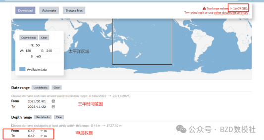 两种思路主要区别在于是否需要数据,以洋流数据为例,我们需要收集2023-2025年日平均单层数据就需要16g,一共50层。单独洋流数据全部下载需要800G,温度、盐度也为1T左右,针对96小时的数模竞赛,对网速、计算机存储、计算机配置都是非常高的挑战。因此,本论文针对第一种思路最后会尝试只针对日本附近构建小的三维模型(5G左右数据量)做展示。