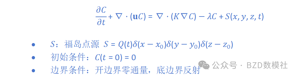 必要假设 :核废水瞬时点源排放,初始体积可忽略;流场数据为年均值+ 季节扰动(可加随机项);放射性核素以保守示踪剂为主(不考虑生物降解,仅衰变);扩散遵循对流-扩散-衰变方程;
