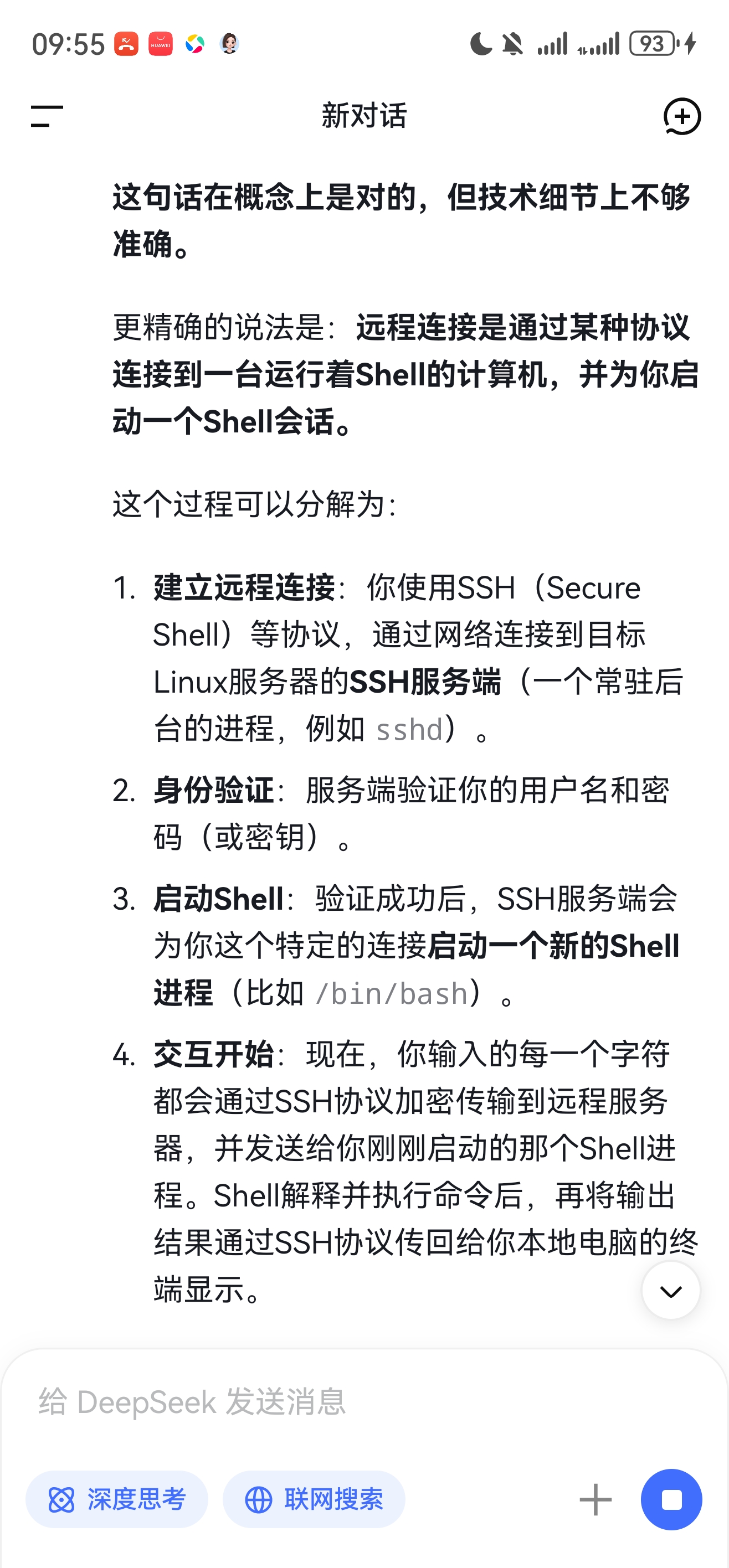 当你用SSH连接远程Linux机器时,连接成功后,远程机器会为你打开一个 shell会话 (比如bash),你通过这个shell来操作远程机器;