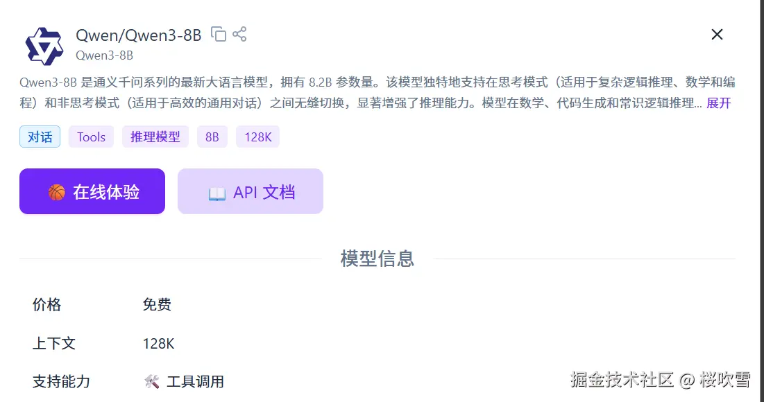 然后模型选择,既然叫ReAct,那么我们需要一个能够推理思考的模型,当然你也可以写提示词让非推理模型生成推理链,不过现在是5202年末,各大厂商都有推出非常牛逼的推理模型,那么咱们简单点选个推理模型就好了,这里我选择了Qwen3-8B,使用ollama本地运行(其实是最近换了新显卡发现本地跑小模型也挺快的),当然也可以选择一些云计算平台,比如火山、百炼等等,都有几十上百万的免费token,要是用完了想白嫖也可以选择硅基流动的免费模型!