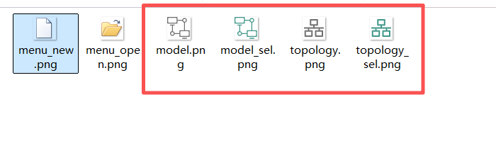 依次添加"建模"、"拓扑"个菜单项,按照前面课程学到的QAction的定义方法进行定义和添加,但要注意因为我们需要用到菜单项状态的切换,所以每个按钮找两个不同颜色的图片以区分状态。先把图标放到我们前面定义的image目录下,在添加到资源qrc中(按照前面课程的内容自行添加,)。