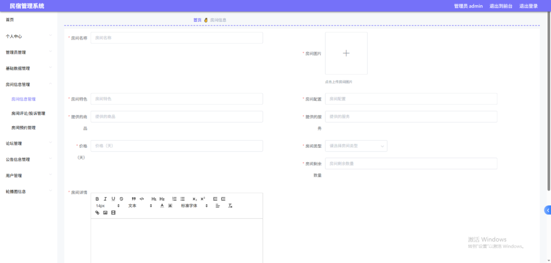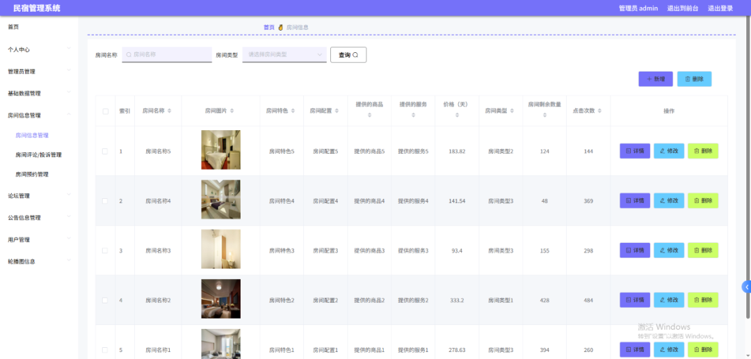 该民宿管理系统功能丰富且全面,涵盖用户信息管理、民宿信息管理、民宿类型管理、公告类型管理、公告信息管理以及论坛信息管理等模块。用户信息管理模块支持用户信息的新增与修改,便于用户维护个人资料;民宿信息管理模块可实现民宿信息的添加、删除和修改,助力运营者高效管理房源;民宿类型管理模块能对民宿类型进行添加、修改和删除,方便对民宿进行分类管理;公告类型和公告信息管理模块,可完成公告类型的添加、删除、修改以及公告信息的删改和添加操作,利于运营者发布各类通知;论坛信息管理模块支持坛信息的修改、删除和添加,为用户和运营者搭建了互动交流的平台,增强用户参与感与粘性。这些功能模块相互协作,构建起一个完整的民宿管理生态,满足民宿运营过程中的各类业务需求。