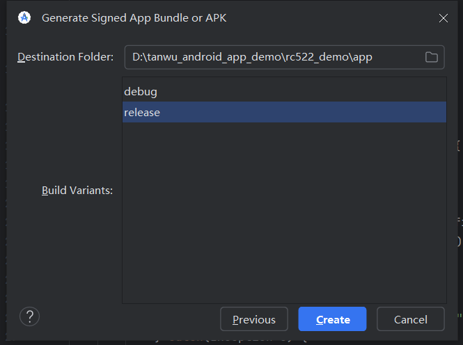 Build Variants 按需选择 debug 还是 release 版本,这里选的 release 点击Create就在创建啦