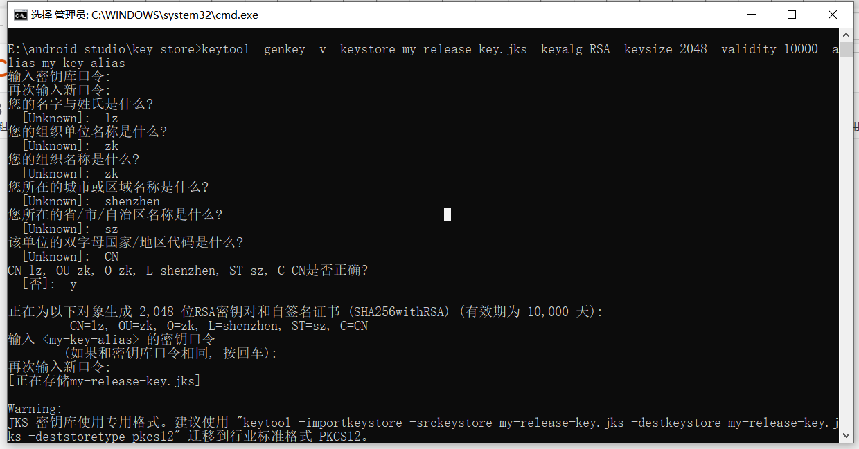 CMD中运行下面命令,生成 my-release-key.jks 的 .jks 证书