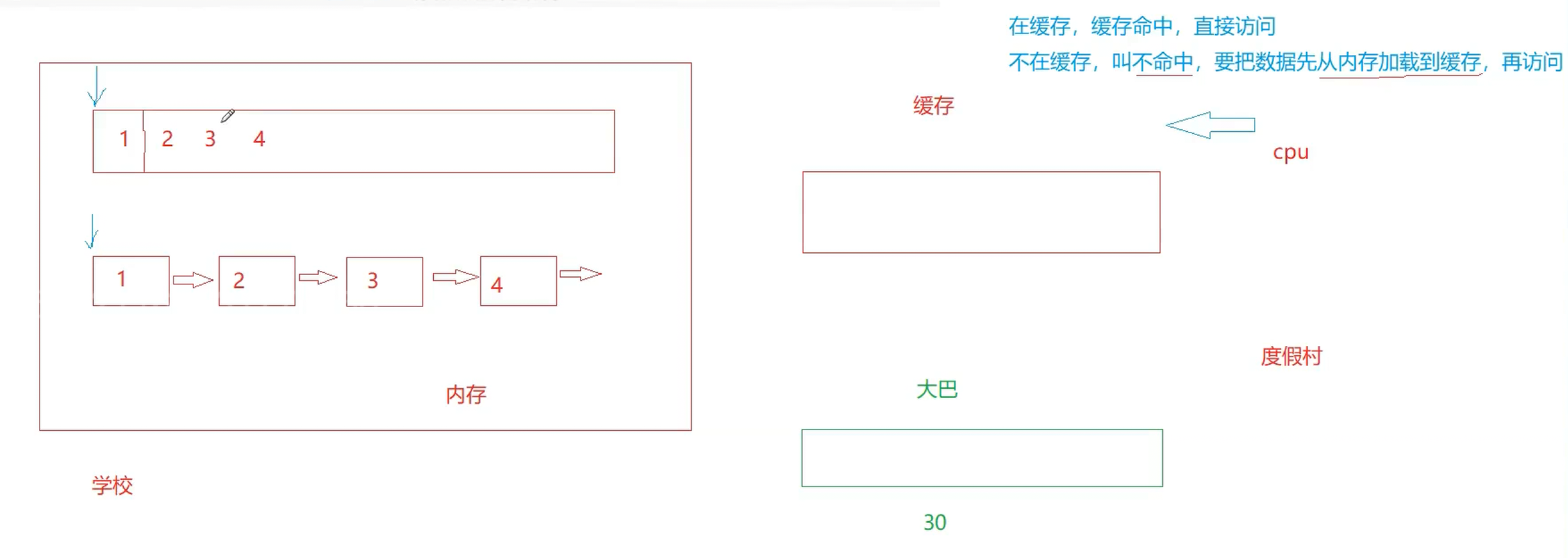 比如一个学校--->内存,校车--->缓存,度假村--->CPU。校车需要把学校里的学生送去度假村,需要用校车接送,此时缓存中有了数据,CPU就可以访问缓存里的数据了。对顺序表类似于:校车有30个空位,老师点名了接送1号学生过去。因为校车还有很多多余的位置,司机(缓存)就会将排了序的同学一起接走,从而达到效率最高