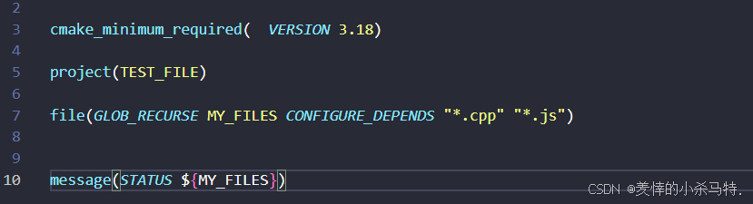 <out_var>:必需 。用于存储匹配结果的文件列表变量(如MY_FILES)。<pattern>:必需 。通配符表达式(如*.cpp,src/**/*.h)。**表示递归任何子目录。[CONFIGURE_DEPENDS]:可选 。推荐添加。让 CMake 在每次构建时重新检查文件列表是否有变化(如新增文件),从而自动重新运行配置,避免因文件系统变动导致构建过期。