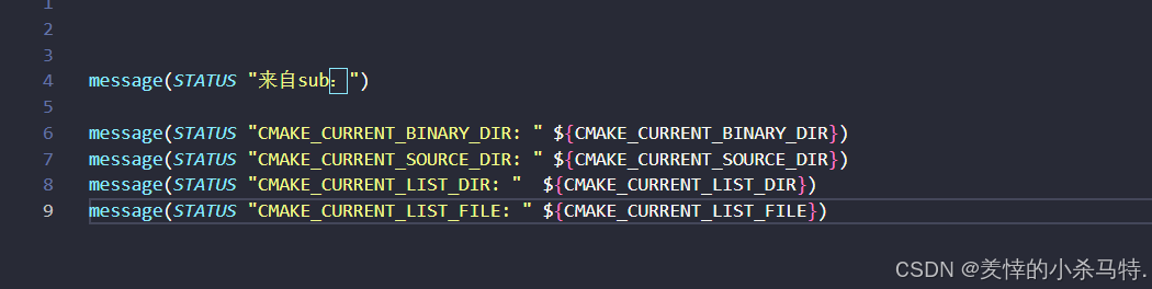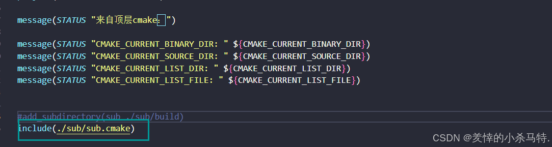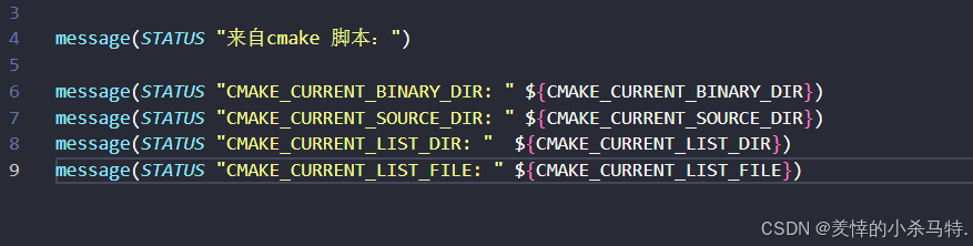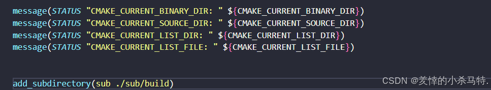 CMAKE_CURRENT_SOURCE_DIR-> 指向子目录的源路径CMAKE_CURRENT_BINARY_DIR-> 指向子目录的构建输出路径CMAKE_CURRENT_LIST_FILE-> 指向子目录的CMakeLists.txt文件CMAKE_CURRENT_LIST_DIR-> 指向子目录的CMakeLists.txt所在目录