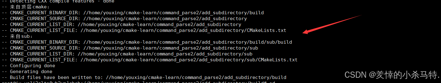CMakeLists.txt的处理,转而进入指定的子目录并执行其内的CMakeLists.txt文件,待子目录处理完毕后,再返回继续执行后续命令。 -