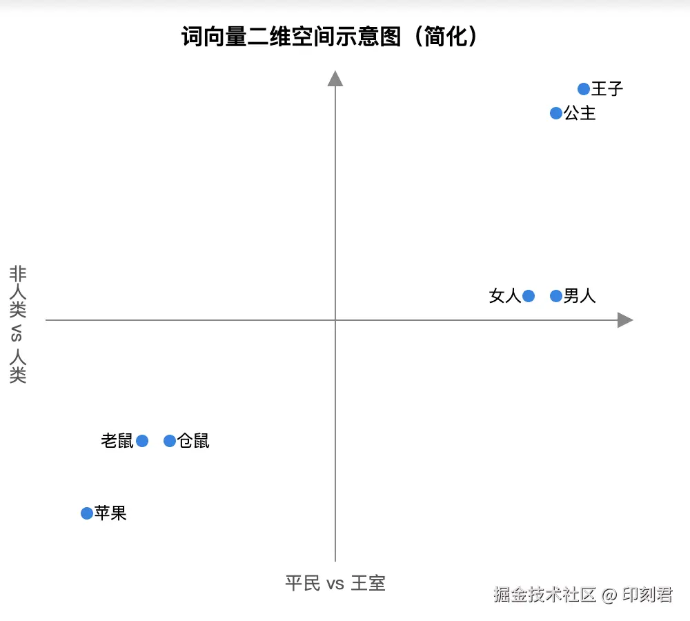 更有趣的是,这些向量支持有意义的数学运算,比如 王子 - 男人 + 女人 ≈ 公主。这意味着模型不仅能学习词义,还能捕捉词与词之间的逻辑关系(如性别、身份差异)。