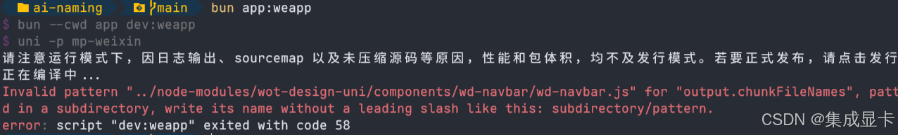 Invalid pattern "../node-modules/wot-design-uni/components/wd-navbar/wd-navbar.js" for "output.chunkFileNames", patterns can be neither absolute nor relative paths. If you want your files to be stored in a subdirectory, write its name without a leading slash like this: subdirectory/pattern.