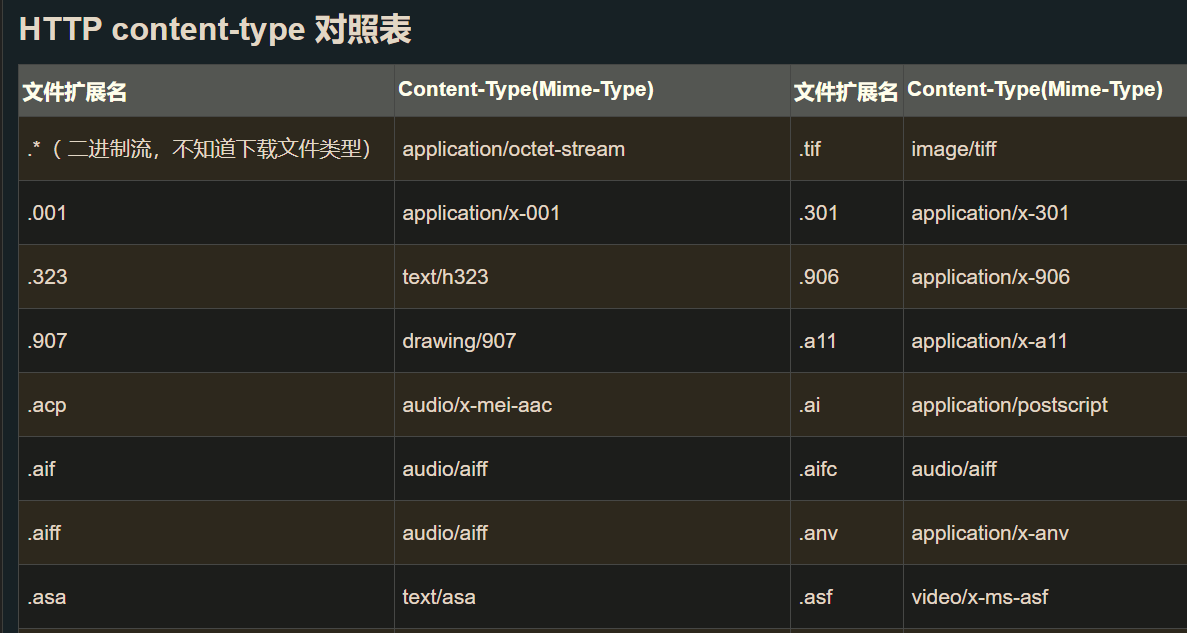 我们已经知道了不管对于http请求还是应答,都有content-Length,作为超文本的http,自已也是有类型的。客户端如何知道正文的类型?通过uri的后缀(所以总归,都是围绕uri展开的,因为这个过程就是IO),知道了uri,就能提取到后缀,如何知道其对应类型。有一个对照表,关于后缀和content-type的映射关系。content-type