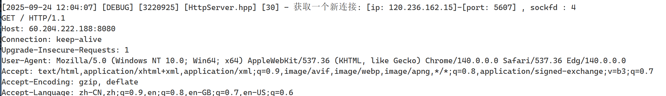 下面我们基于上篇文章封装的Socket类,以浏览器作为客户端,来访问我们的服务器,我们的服务器底层以创建多进程来向客户端提供服务。下面,我们通过代码,获取到了浏览器的请求字段,直接看看浏览器的请求字段长什么样: