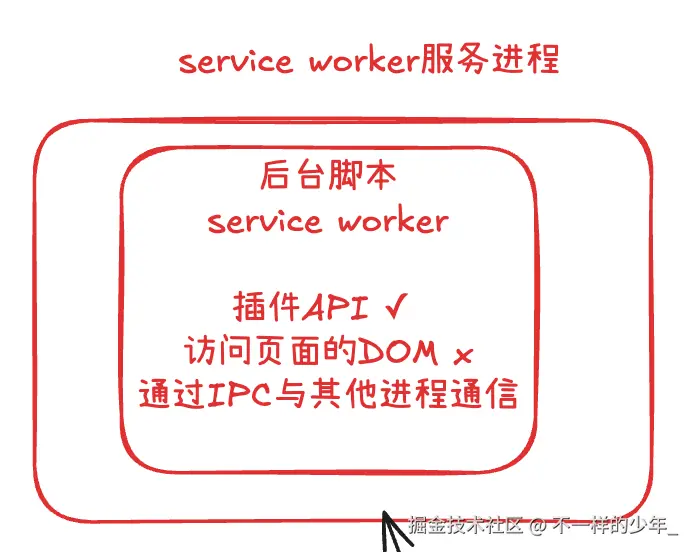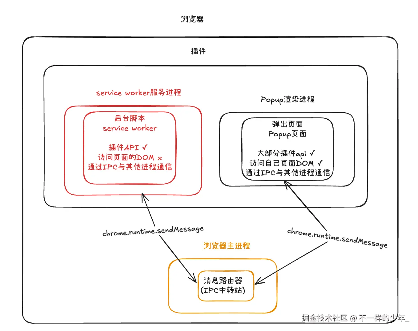 虽然都popup页面和service worker属于同一个扩展,但它们运行在不同进程/沙箱中,无法直接共享内存或调用函数,必须通过浏览器主进程的消息路由(IPC)中转,如下图:
