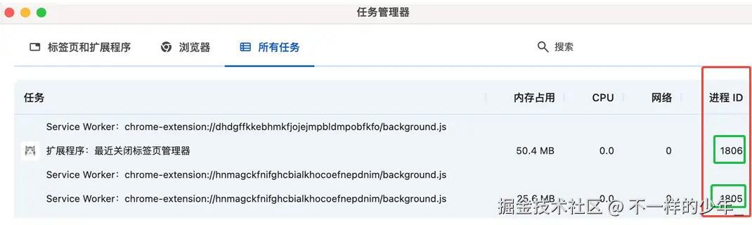 我们打开chrome的任务管理器看一个插件,可以看出service worker和popup分别在两个进程中运行,如下图: