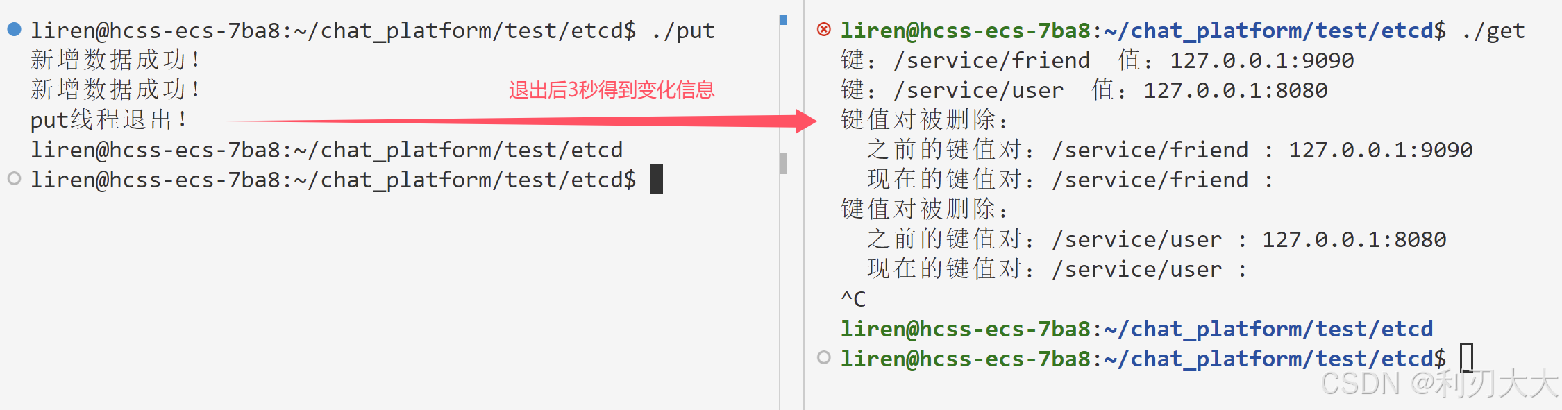 liren@hcss-ecs-7ba8:~/chat_platform/test/etcd$ etcdctl del mykey # 删除键值对