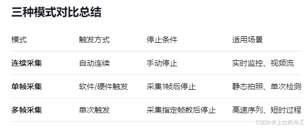 单帧采集指的是一次触发只采集一帧图像,触发方式可以是软触发、可以是硬触发,一般在工业相机中需要开启触发模式。