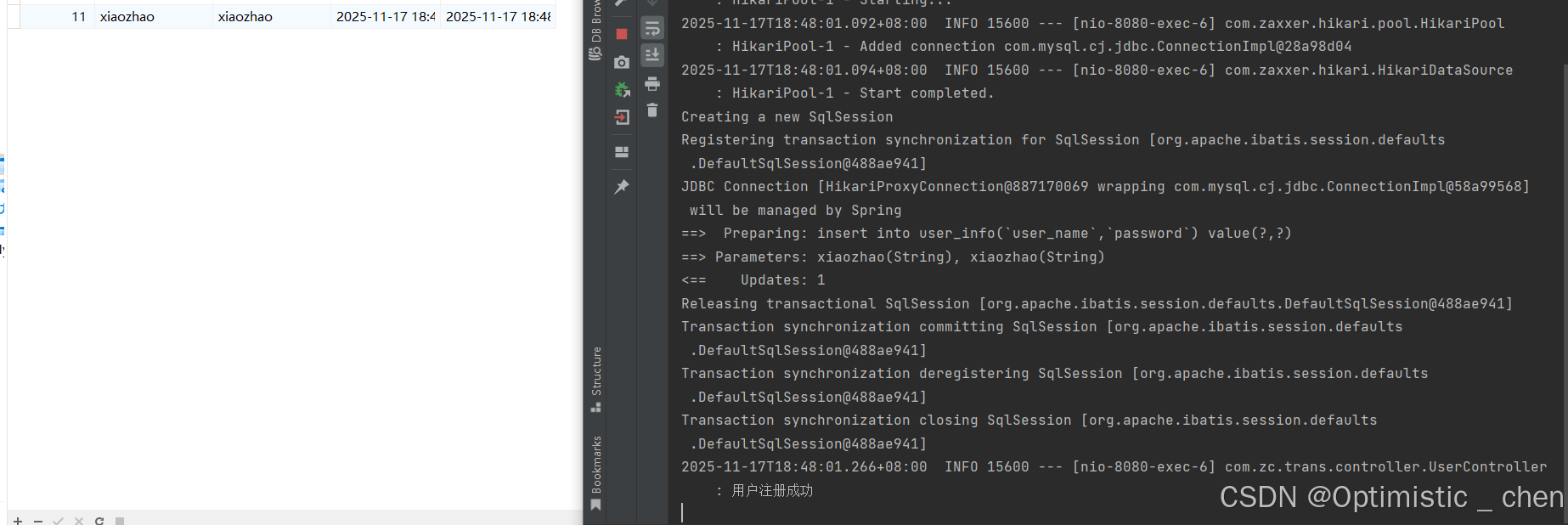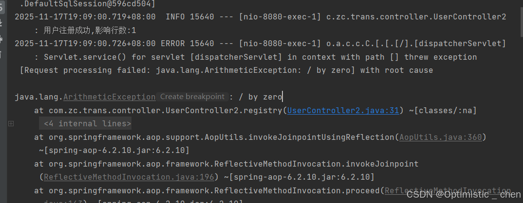 虽然用户注册成功,但是去观察数据库发现没有新增数据,说明事务进行了回滚。