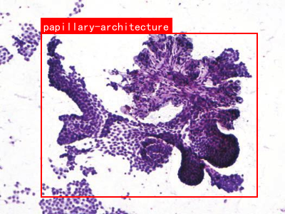 本图展示了甲状腺乳头状癌的典型病理组织学特征。图中可见肿瘤细胞呈乳头状结构 排列,这是甲状腺乳头状癌的核心诊断标志之一------肿瘤细胞围绕纤维血管轴心形成分支状或指状突起,构成"乳头"样形态;细胞核呈现特征性的毛玻璃样改变(染色质淡染、均匀分布),部分细胞核可见核沟及核内假包涵体(因图像分辨率限制未完全清晰显示,但为该癌种的标志性细胞核表现);间质中可见丰富的纤维结缔组织增生,部分区域伴淋巴细胞浸润(符合慢性淋巴细胞性甲状腺炎背景)。红色标注框内的"papillary-architecture"明确指向乳头状结构这一关键形态特征。这些病理特征是甲状腺乳头状癌与其他甲状腺肿瘤(如滤泡性癌、髓样癌)鉴别的重要依据,结合细胞核异型性、乳头状生长模式及间质反应,可完成对该癌种的病理诊断与分类。