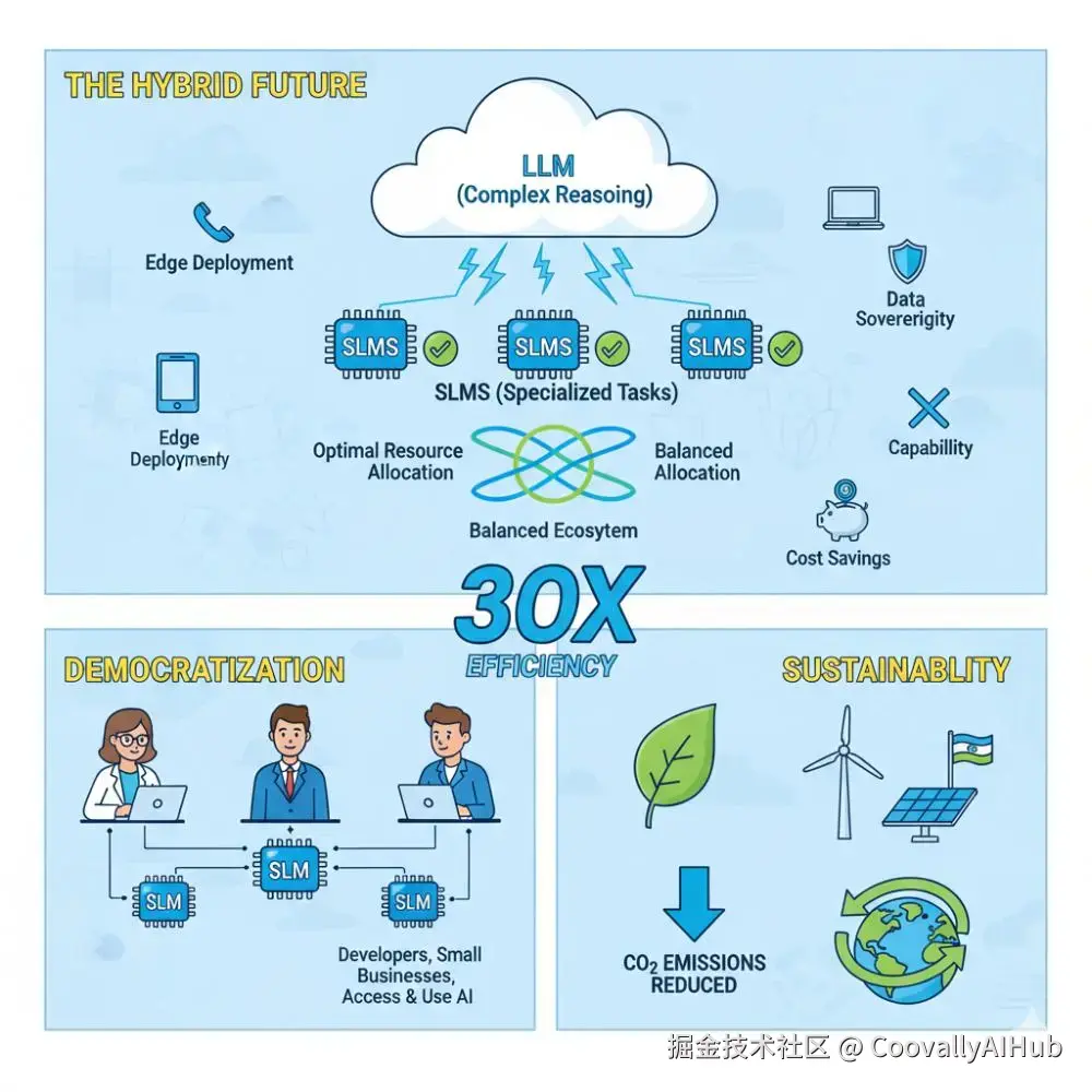 小模型智能体的发展不会取代大模型,而是形成一种互补共生的关系。企业正在将两者结合起来,构建混合架构,以优化不同的使用场景:大模型处理复杂的推理、战略规划和创造性任务;