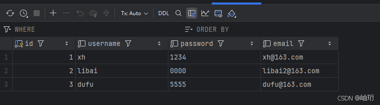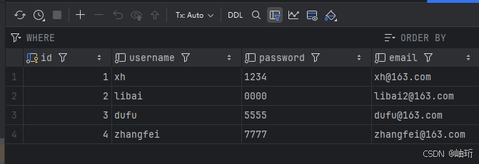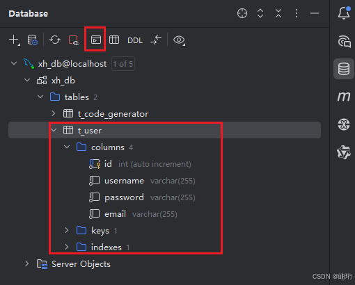 如在本地起了一个mysql服务,并且账号为root密码为1234,数据库名称为xh_db,表名为t_user