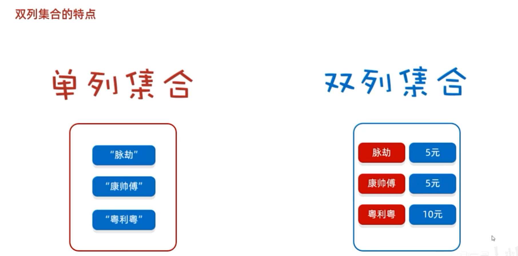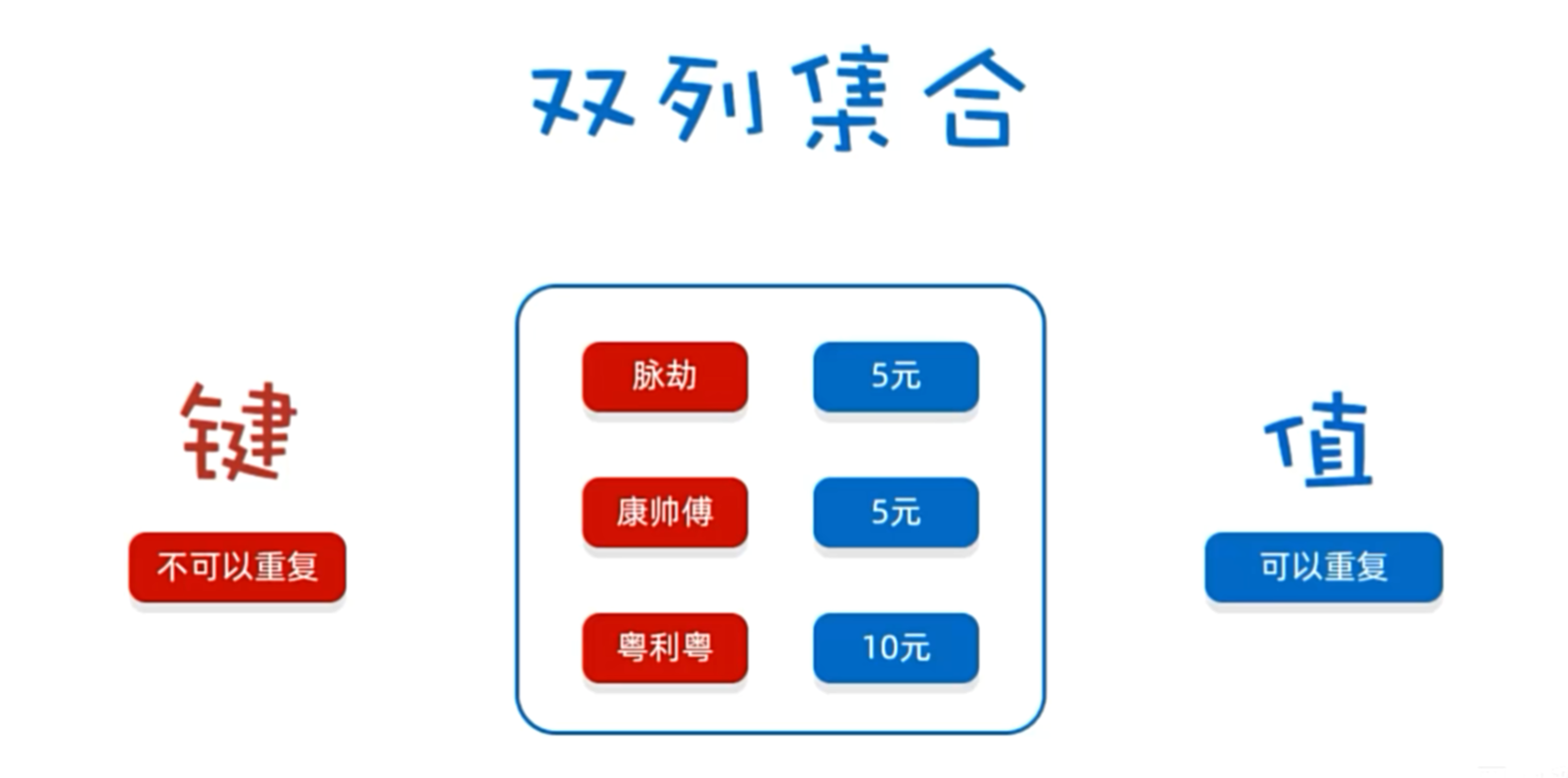 红色的我们称之为"键",蓝色的我们称之为"值"。键和值一一对应。