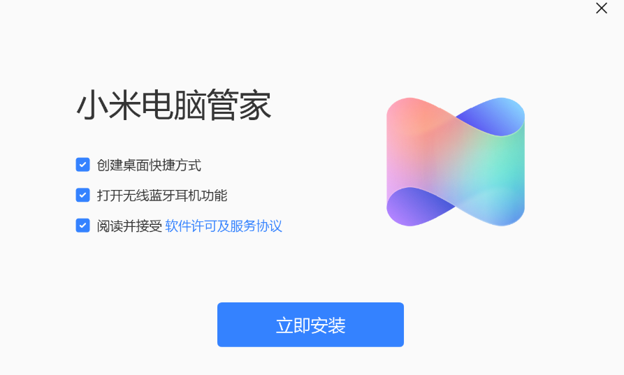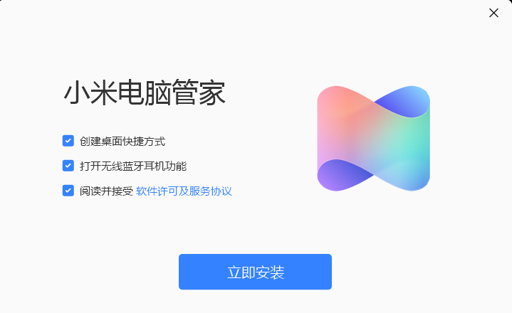 双击运行「免机型验证-小米电脑管家.exe」,勾选"阅读并安装软件许可协议",然后点击下面的「立即安装」。