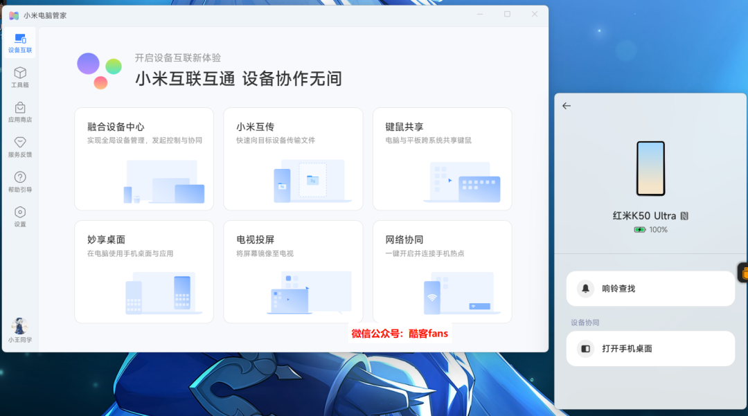 电脑重启开机后,打开桌面上的小米电脑管家,登录小米账号,然后打开小米手机上的「互联互通」功能就能使用了。