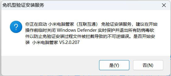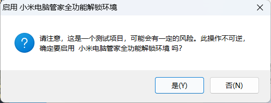 安装完成后,还会有一个「启用小米电脑管家全功能解锁环境」的弹窗,这个根据你自己的使用需求,需要功能丰富点的,就点击「是」来进行安装;