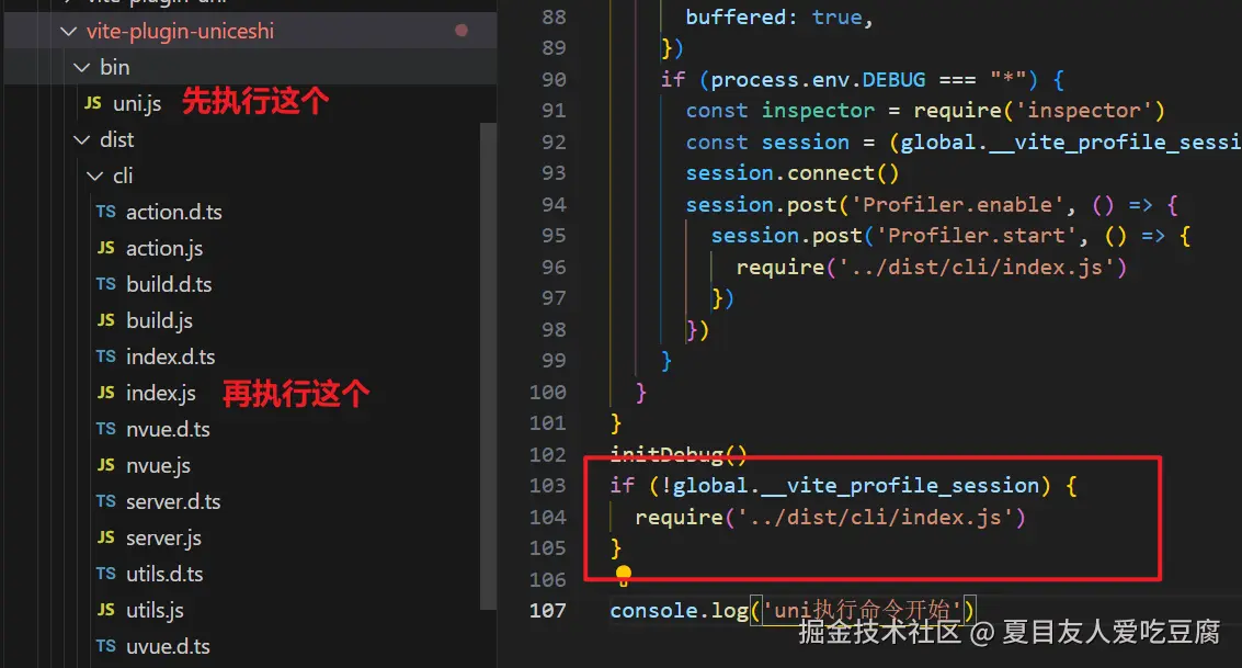 scipts的执行路径在node_modules/.bin。找到uni.CMD(window系统是这个),在uni.CMD中,找到执行文件是\node_modules@dcloudio\vite-plugin-uni\bin\uni.js。uni.js执行../dist/cli/index.js文件