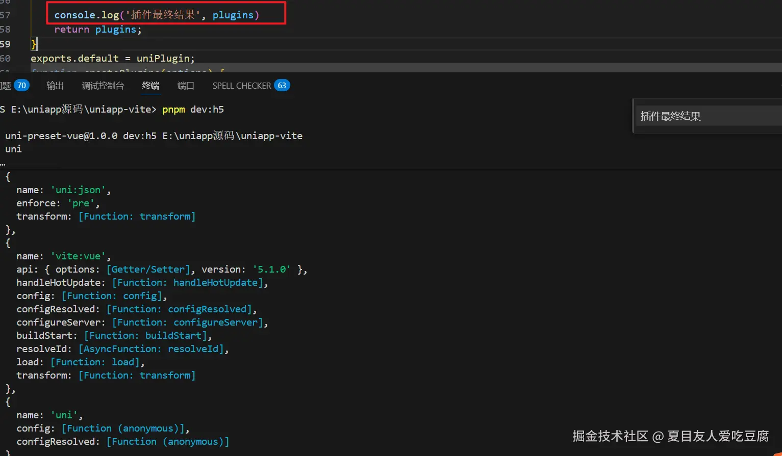 先打印插件最终的结果看看。发现vite-plugin-uni最终分裂出了一堆插件。我的思路是:查看是如何分裂出来的,然后根据我现在的业务需求,找到pages.json的处理插件,了解其原理看看怎么调整。