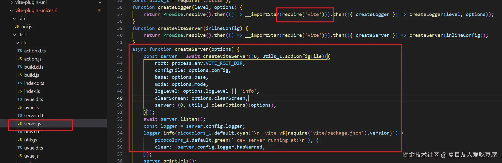 由于我执行的是最基础的命令"dev:h5": "uni"。这个我可以不理,直接看配置完文件后,uniapp做了什么。追寻过程不赘述。最终执行的是\node_modules@dcloudio\vite-plugin-uni\dist\cli\server.js文件里面的createServer方法。也就是启动了vite的本地服务。