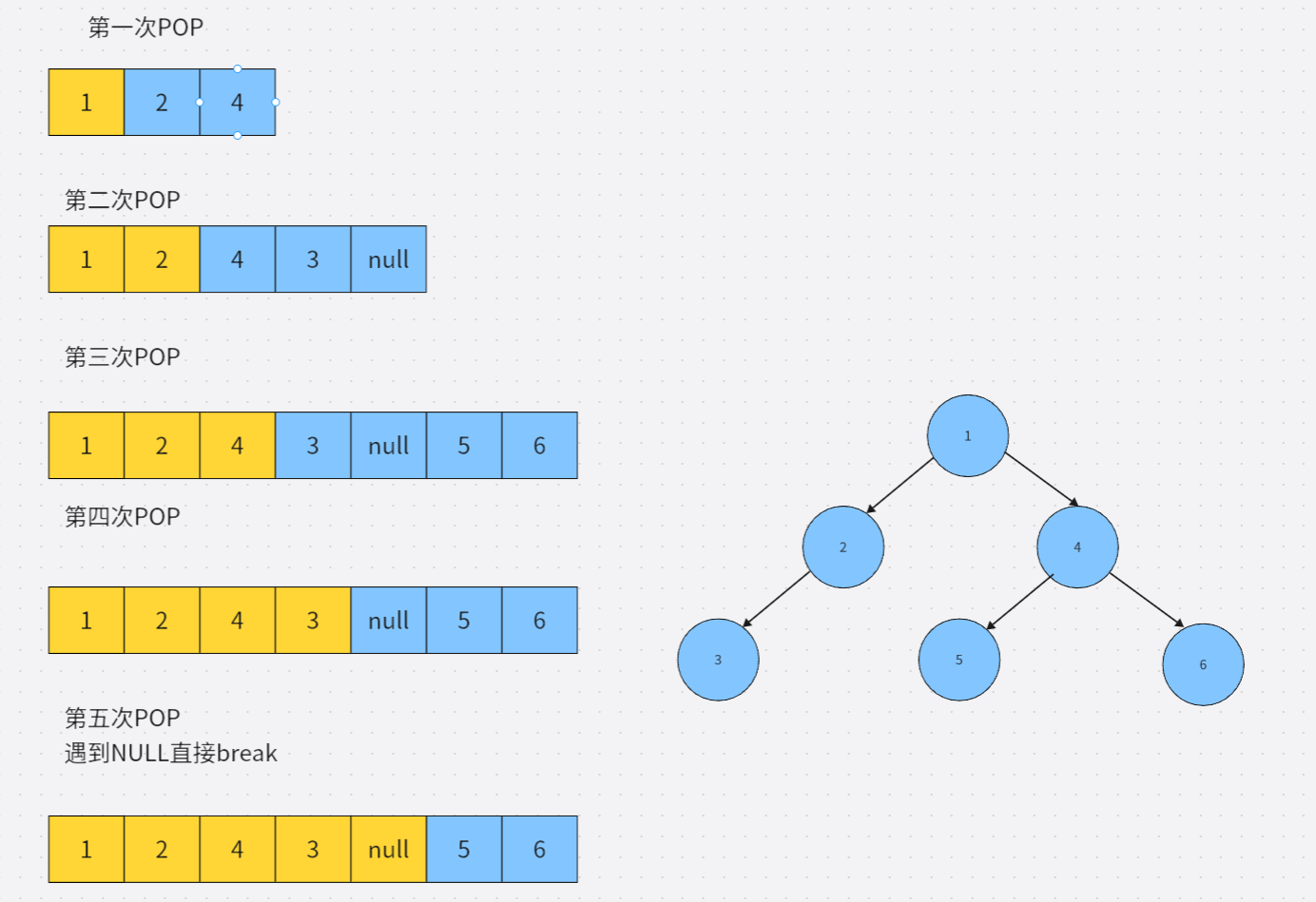 - 一旦出现空节点(null),后续所有节点必须都是空节点 (即不允许空节点后还有非空节点)。除最后一层外,所有层必须被节点完全填满(通过层序遍历中 "空节点出现的时机" 判断)