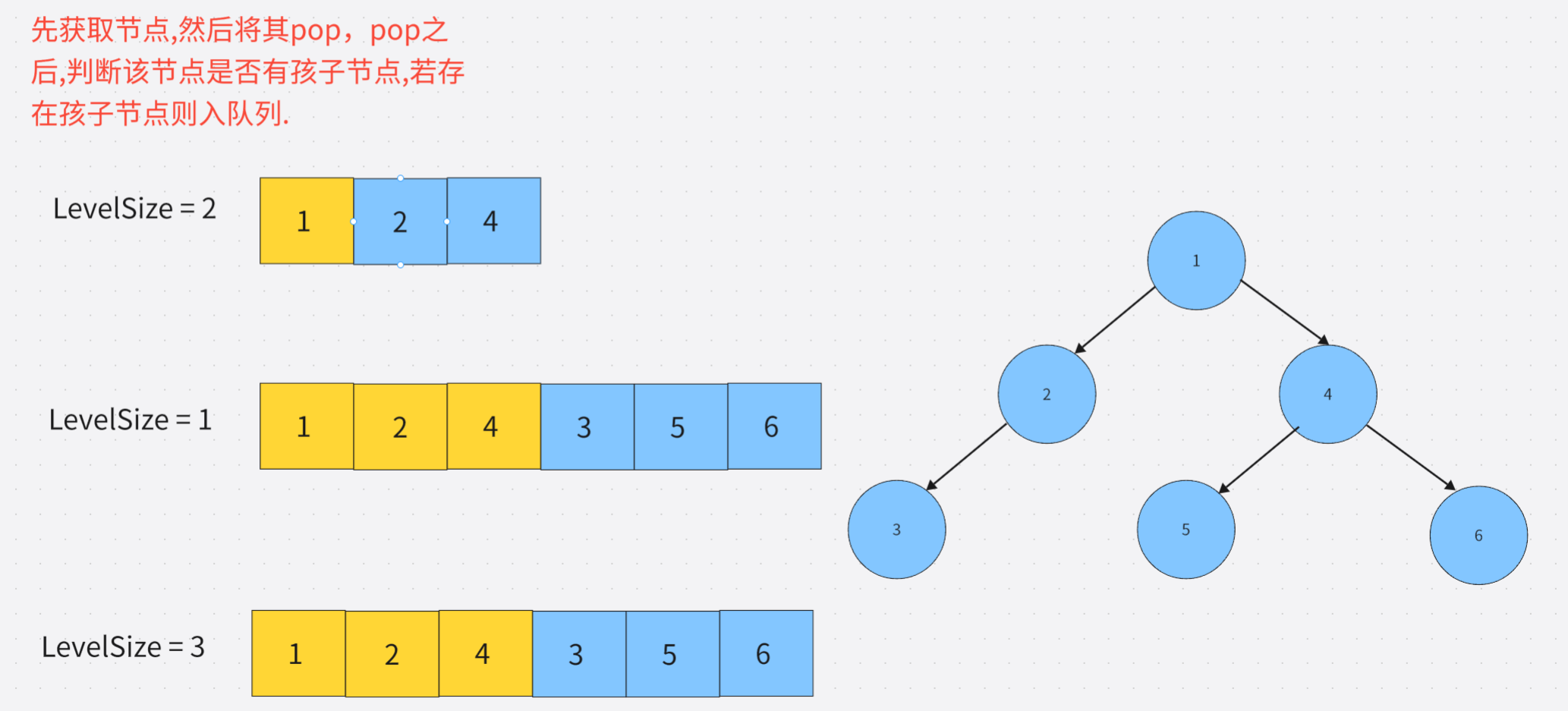 - pop之后判断是否有孩子节点,若存在孩子节点则入队列.