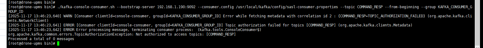 [root@drone-upms bin]# ./kafka-console-consumer.sh --bootstrap-server 192.168.1.190:9092 --consumer.config /usr/local/kafka/config/sasl-consumer.properties --topic COMMAND_RESP --from-beginning --group KAFKA_CONSUMER_GROUP_ID