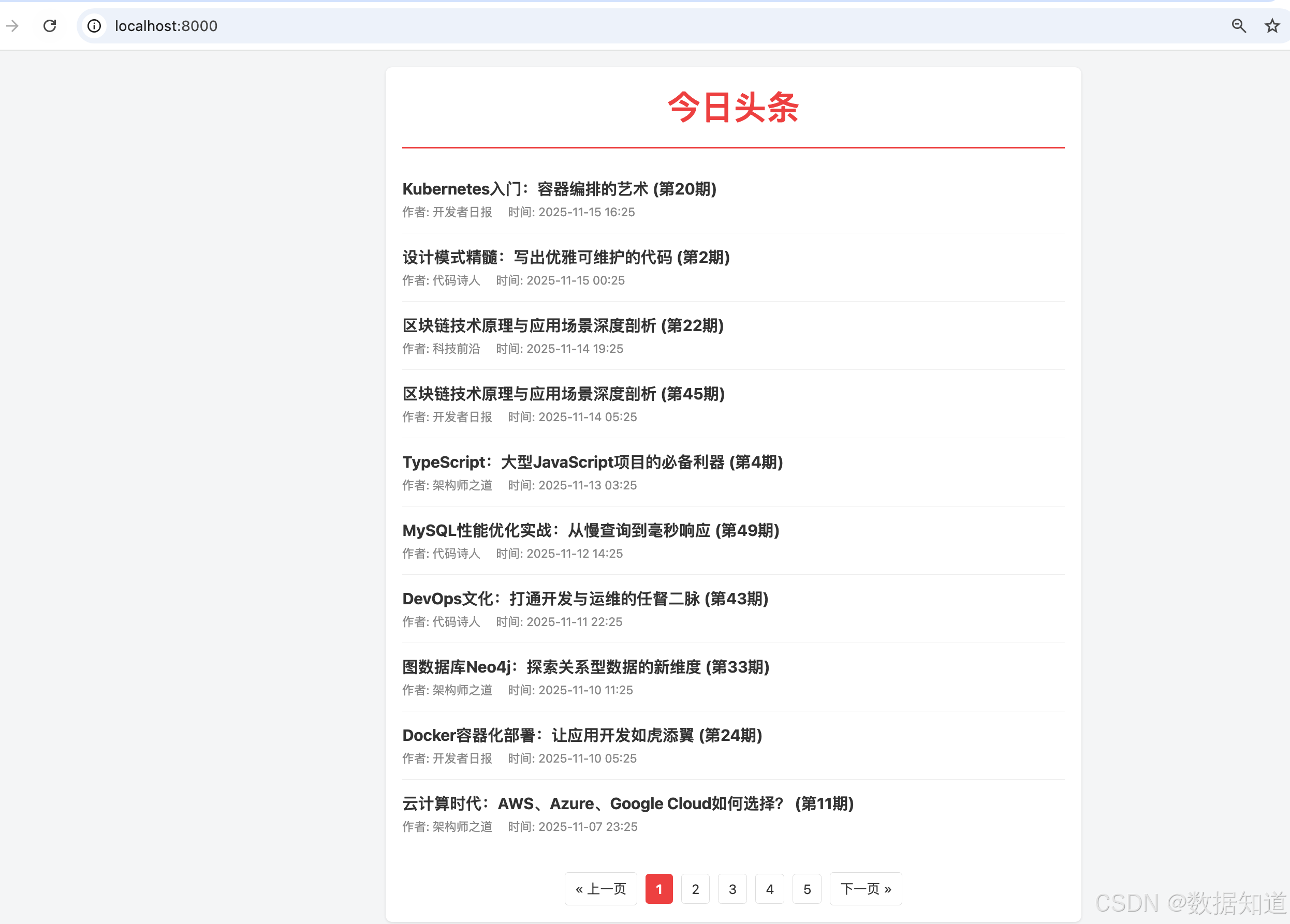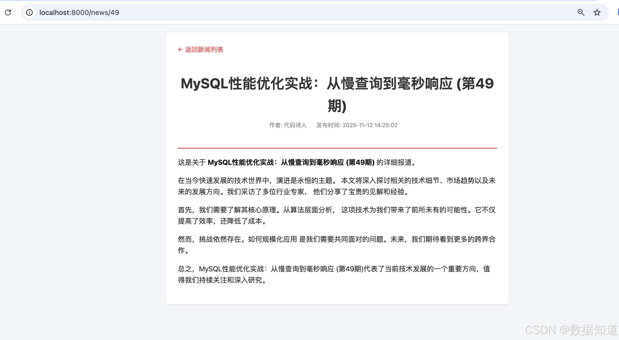 http://127.0.0.1:8000。你将看到新闻列表,底部有分页导航。 - 新闻详情页:点击任意一条新闻的标题,会跳转到详情页。
